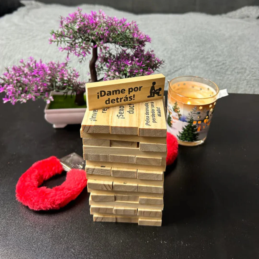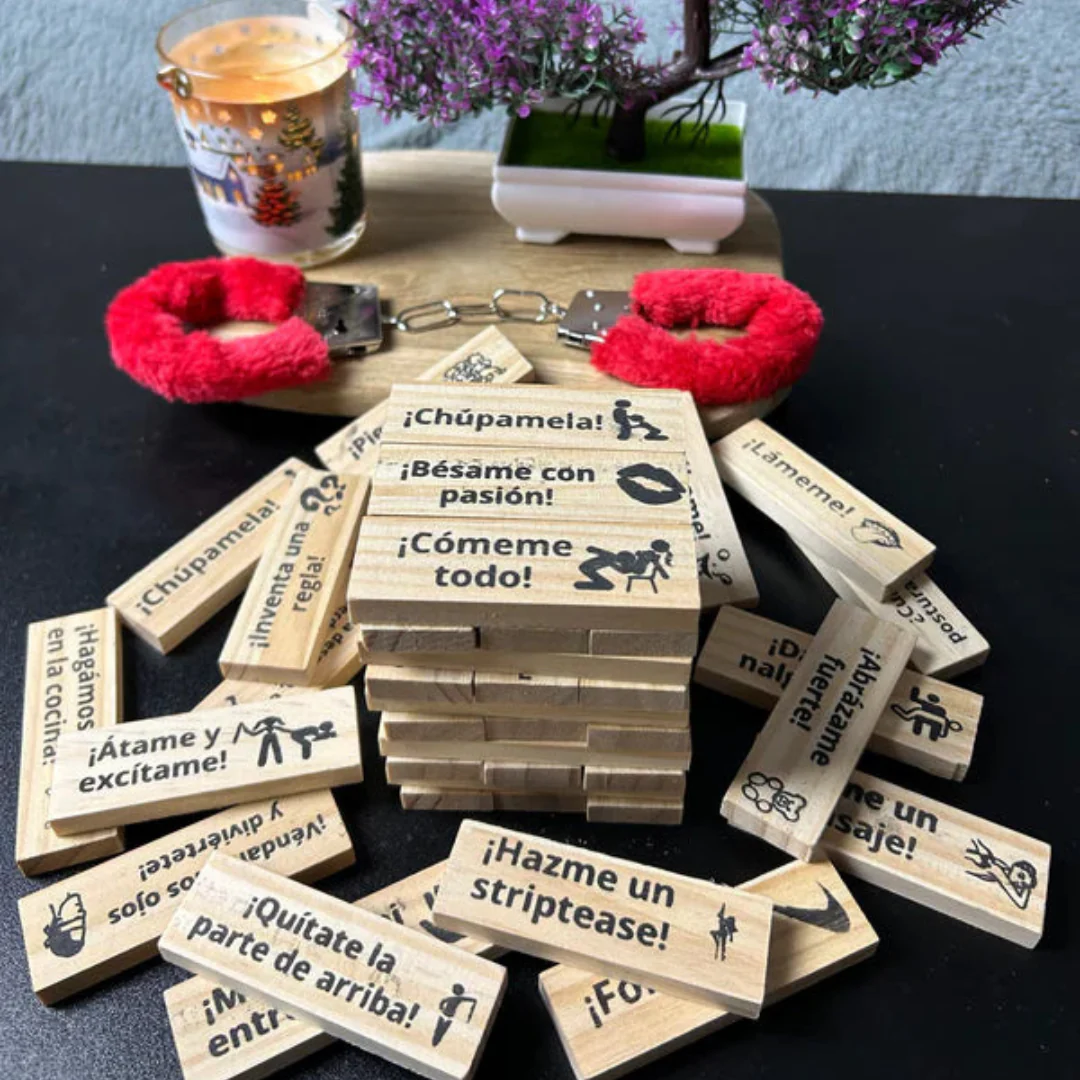El juego incluye 20 o 48 fichas de madera (según la variante que elijas), cada una con un reto sexual distinto.